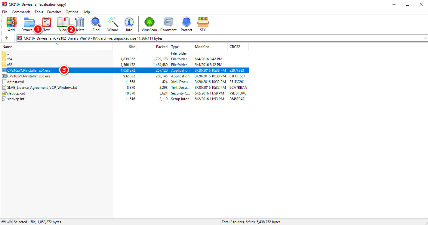 2. Install driver of CP2102 by double clicking the compressed file->CP2102\_Drivers\_Win10->double clik "CP210xVCPInstaller\_x64.exe" to install directly
