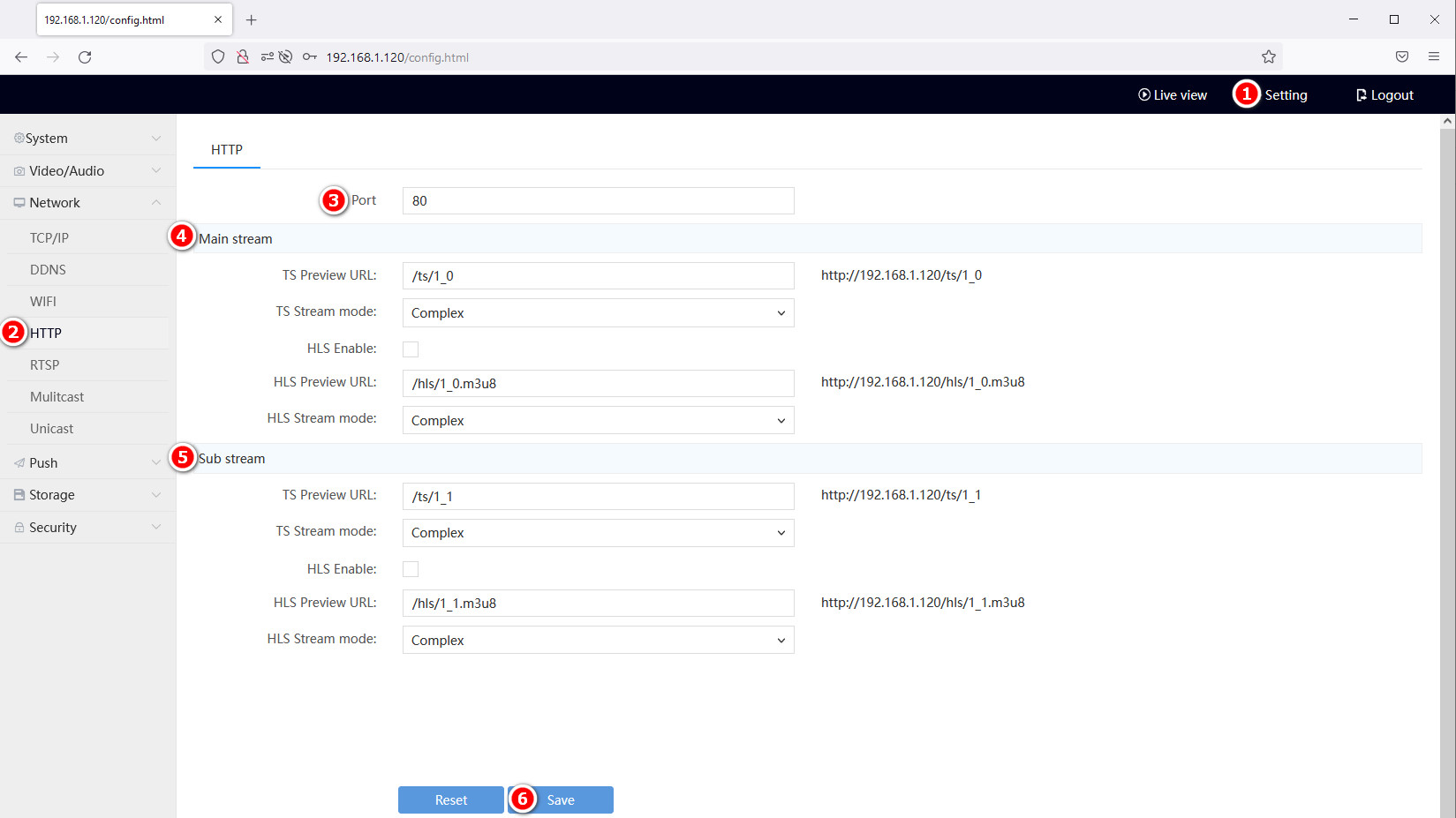| Sub Stream  | <p>TS Preview URL: <http://192.168.1.120/ts/1_1><em>;</em><br>TS Stream mode<em>: Complex/Video/Audio;</em><br>HLS Preview URL<em>:</em> <http://192.168.1.120/hls/1_1.m3u8>;<br>HLS Stream mode: Complex/Video/Audio;</p> |