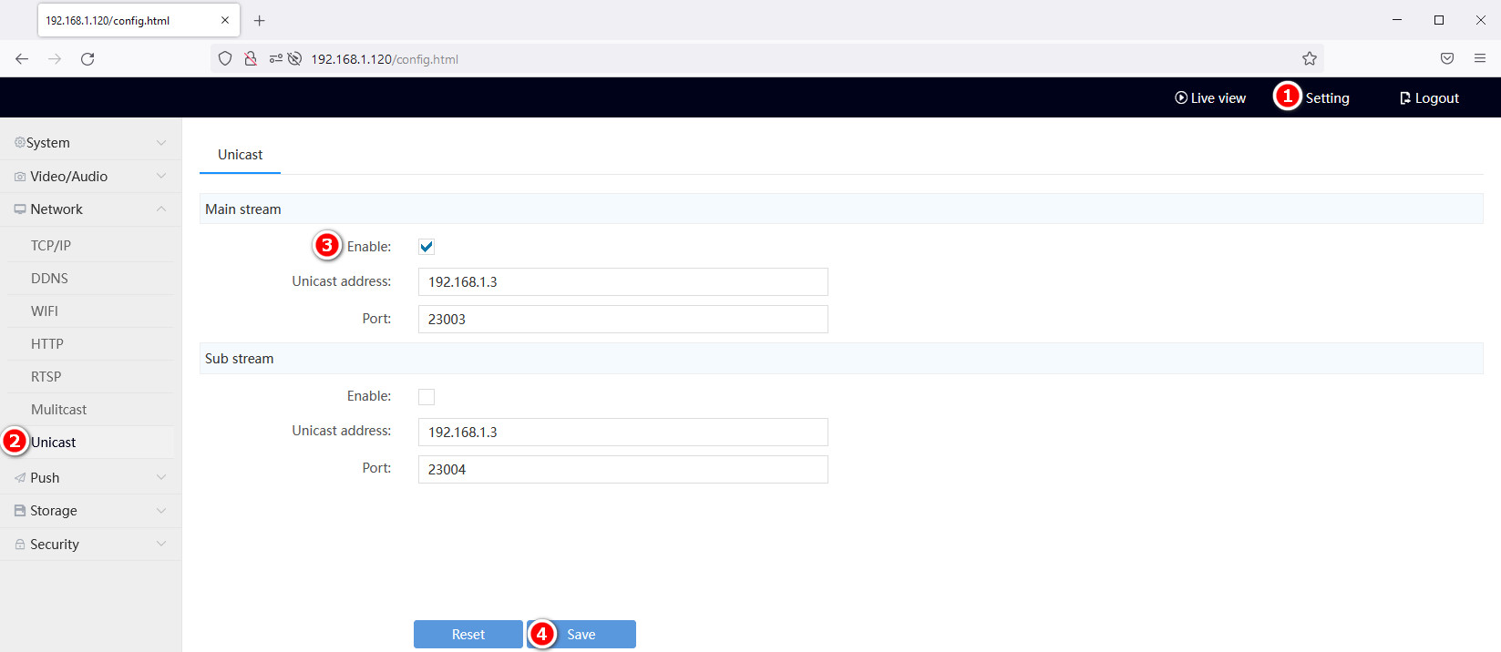 | Sub Stream  | <p>Enable: Check the checkbox;<br>Unicast address: 192.168.1.3;<br>Port: change port if required;</p> |