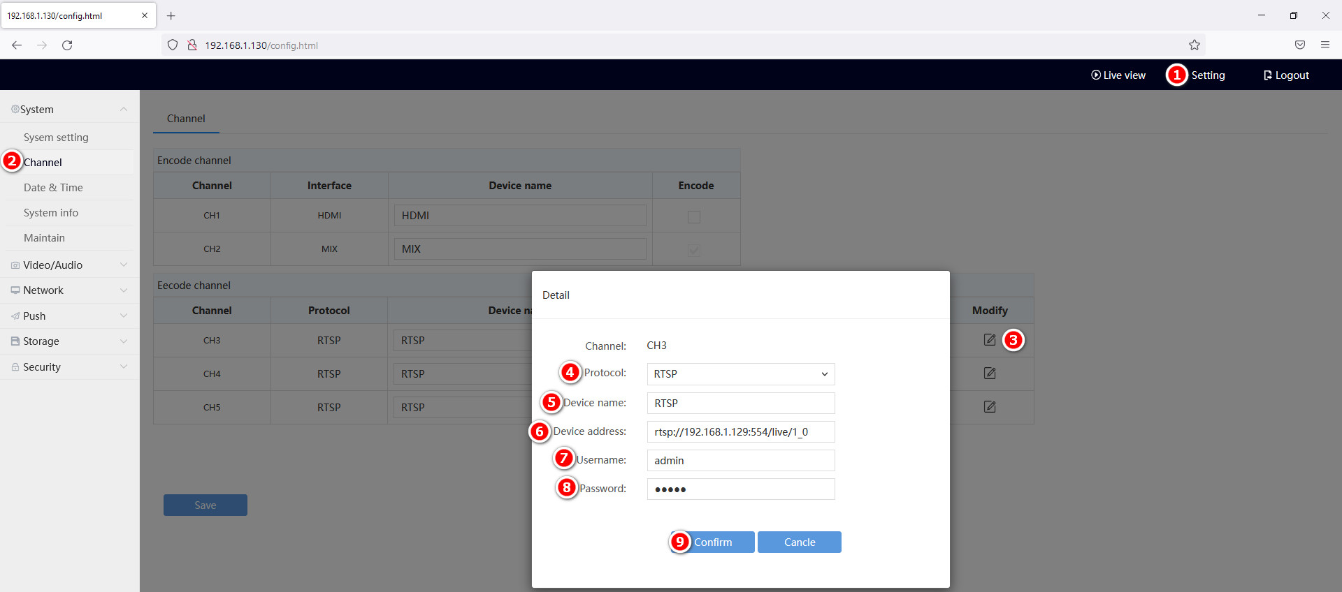 * Add CH3->Click"Modify"->Select Protocol (SQ, RTSP, RTMP, TS\[TS, HLS])